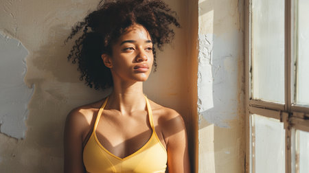 Woman in a yellow sport bra on a white background, closeup.