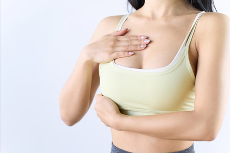 Woman hands doing breast self exam for checking lumps and signs of breast cancer. Medical, healthcare for advertising concept.