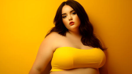 young woman posing in studio over yellow background. Generated with AI