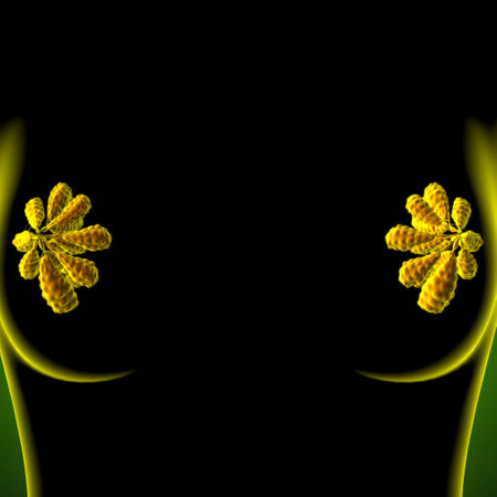 Concept of a pleasant smell from the armpits. Girl has yellow flowers sandwiched between her arms and chest. body care. women health. Chrysanthemums. Bodypositive and struggle for female naturalness