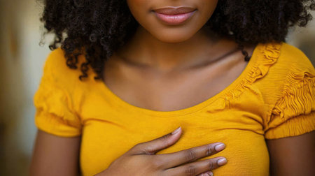 Young woman in mustard yellow top expressing emotions