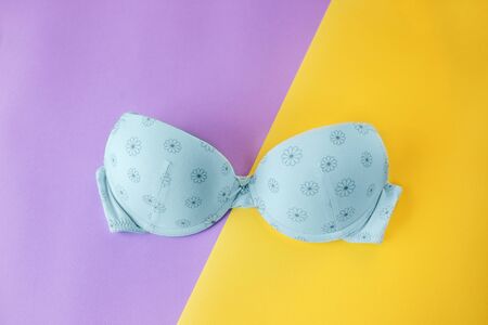 Blue bra on a yellow and purple background. Place for text.