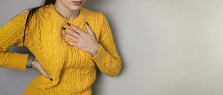 Young woman with sweating under armpit in yellow dress isolated on gray