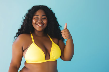Portrait of happy smiling fat African American woman wearing yellow swimsuit showing thumb up sign isolated on a blue studio background. Traveling, body positive, vacation and summer journey concept.