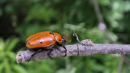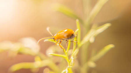 A cucurbit beetle is looking for food on a fungus growing on bush. This insect has the scientific name Aulacophora indica.
