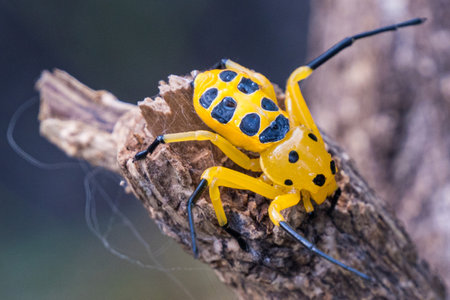 an eight spotted crab spider or Platythomisus octomaculatus. Eight-spotted crab spiders are yellow with four black spots on their cephalothorax and seven on their abdomen. The spider in the image is black and yellow, and its spots are arranged differently.