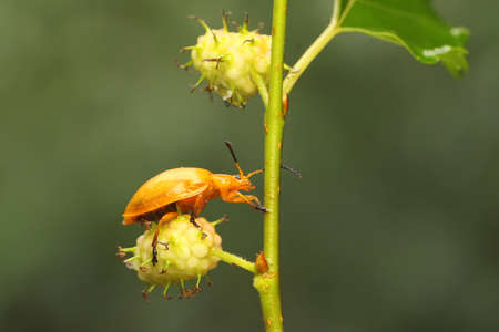 A cucurbit beetle is looking for food on a wild fruit. This insect has the scientific name Aulacophora indica