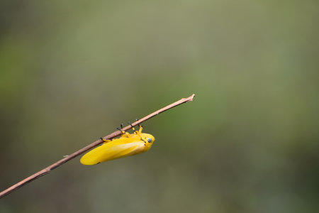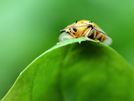 A bright yellow insect with large eyes rests on a vibrant green leaf, showcasing its wings in a poised position. The dark background emphasizes the vivid colors and details of the subject.