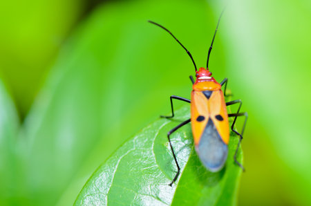 Red Cotton Bug Dysdercus cingulatus Close-up on a green leaf