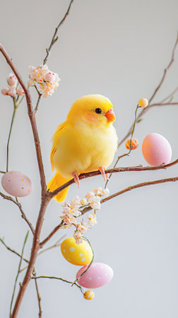 Bright yellow budgie bird perched on easter tree branch with decorated eggs and blossoming flowers. Vertical.