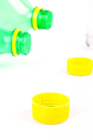 White plastic bottles placed diagonally and asymmetric with a green cap in the center on a yellow background. Plastic recycling to yellow container