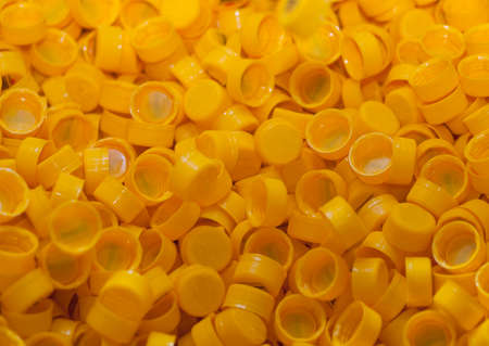Plastic caps from bottles (black and yellow) on black background