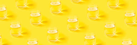 Summer pattern with glasses of lemonade on yellow background.
