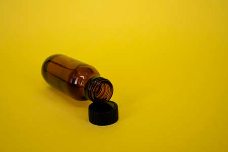 close up of a yellow bottle lying on side on white background with clipping path