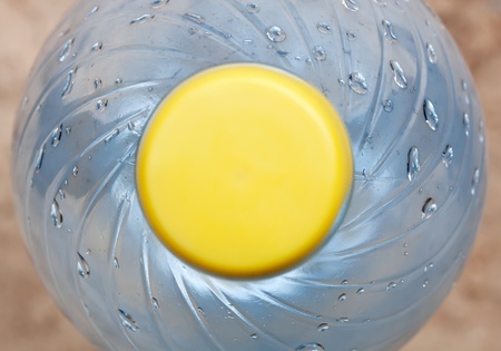 Plastic water bottle with yellow cap on the yellow with copy space