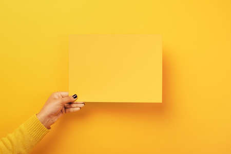 piece of paper in the female hand over yellow trendy background, empty blank for advertisement