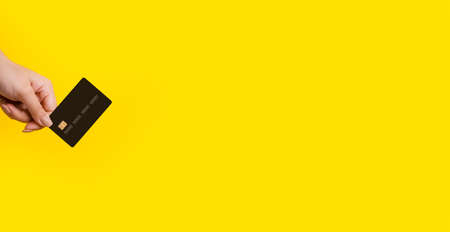 bank card in hand over yellow background, panoramic mock-up with space for text