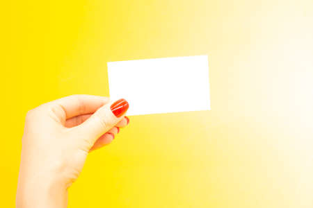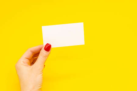 Female hand holding empty paper white business card on a yellow background. Copy space