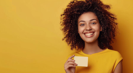 Woman holding in hands demonstrating bank card novelty on yellow background