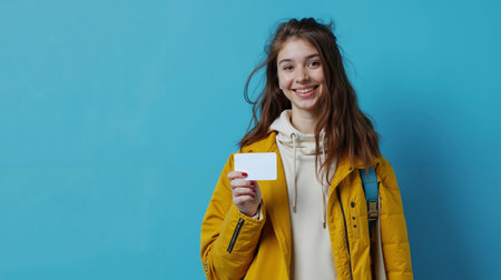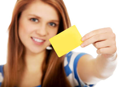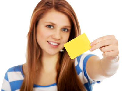 Teenage woman holding empty business card.