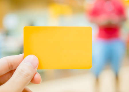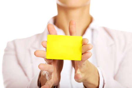 White card in a female hand on a yellow background