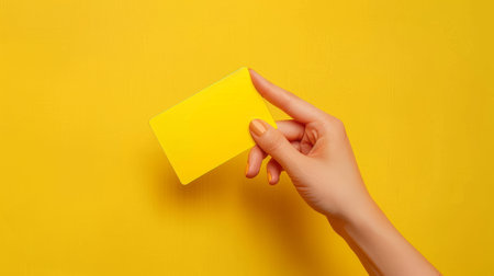 Raised female hand holding a white card. Mock up. Yellow background. Copy space.