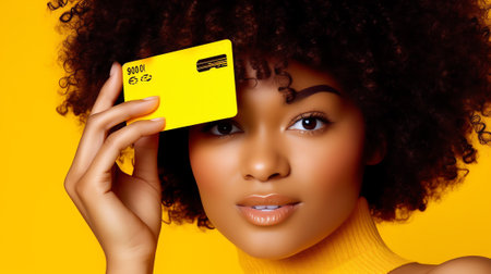 Cashless payment. Banking transfer. Money transaction. Closeup of Afro woman hand holding credit card isolated on yellow empty space background.