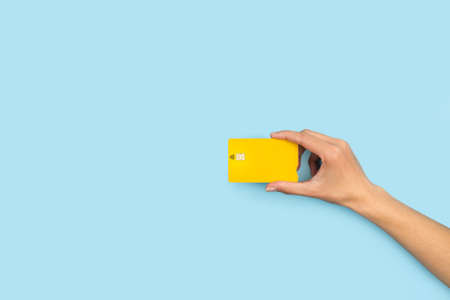 Woman hand holding a yellow credit card on a light blue background