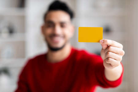 Smiling young arab male shopaholic with beard shows credit card in home office interior, free space, blurred