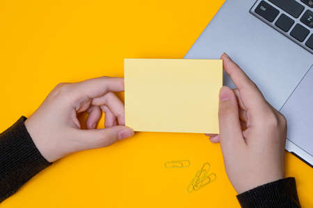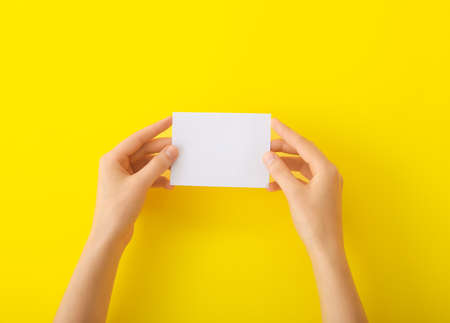 Woman's hands hold a white card. Close up. Yellow background. Mock up.