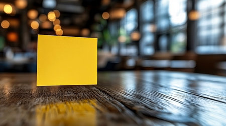 A yellow note rests prominently on a rustic wooden table inside a charming cafe. The inviting atmosphere features soft lighting and stylish decor, creating a relaxed vibe for visitors.