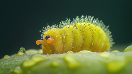 This close-up image captures a vivid yellow caterpillar resting on a leaf, adorned with glistening dew drops. Its fuzzy texture and bright color create an enchanting sight, showcasing the fascinating details of nature.