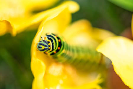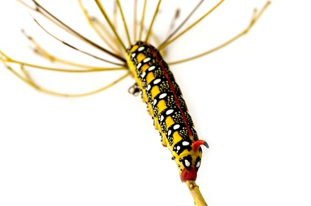 caterpillar of butterfly swallowtail - machaon, feeds on dill - fennel, side view, light background