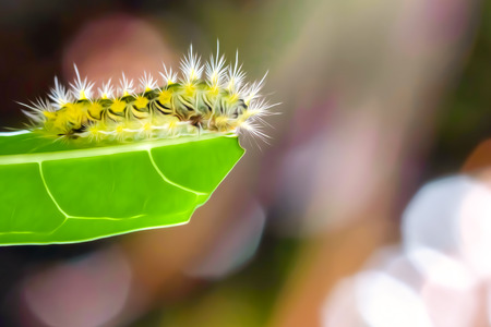 Colorful caterpillar on a green leaf, macro nature view. Wildlife and insect photography concept