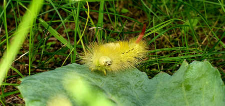 Yellow Fuzzy Caterpillar eating maple leaf close-up shot