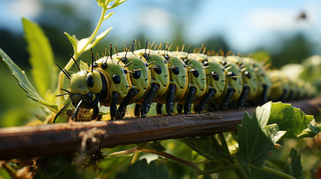 a black and yellow caterpillar crawls gracefully through a vibrant green field, bathed in the enchanting glow of golden light. this captivating scene combines elements of vray tracing, light indigo, and amber hues. the intricate details of this insect's form tell a colorful story, reminiscent of a skilled wood sculptor's work. mythological references add an extra layer of intrigue to this mesmerizing composition. ai generated