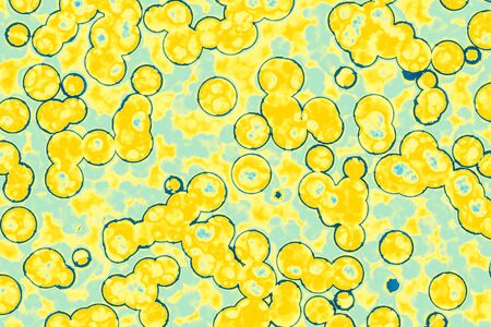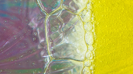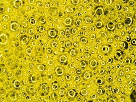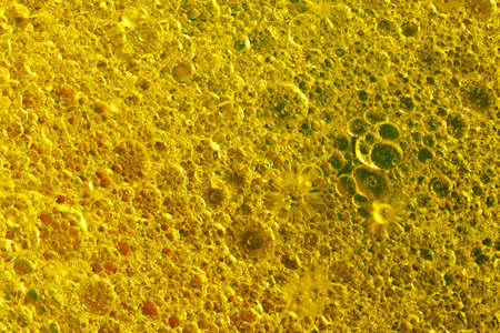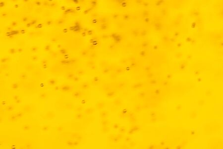 Abstract yellow background with water bubbles from oil and fat solvent close up macro photography
