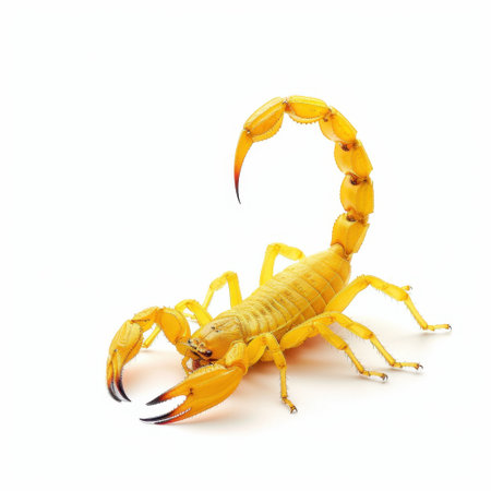 This close-up image features a bright yellow scorpion with an arched tail and prominent claws. Perfect for educational materials, nature studies, or insect research projects.