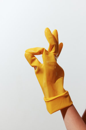 Person in yellow rubber glove making an ok sign with one hand