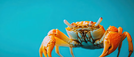 A bright orange crab displays its claws against an aqua backdrop showcasing its intricate details and natural beauty.