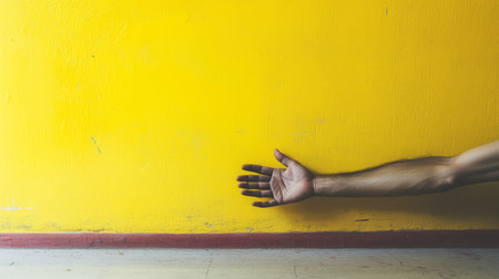 A reaching hand extends toward a bright yellow wall in an indoor setting, showcasing an interplay of light and shadow