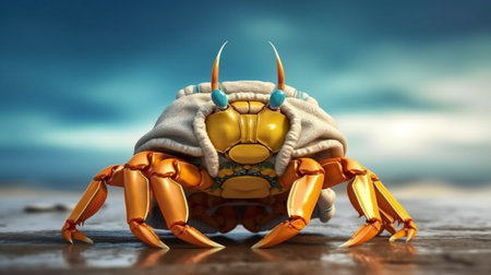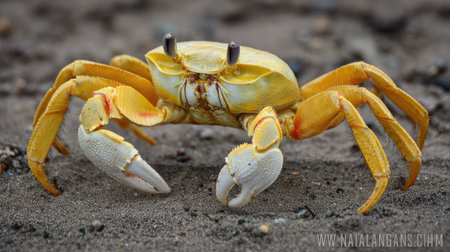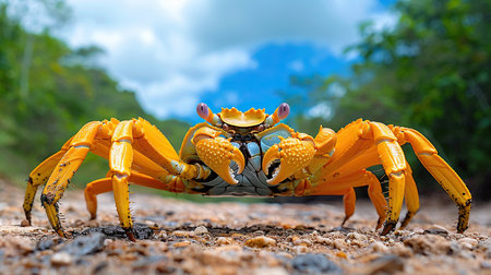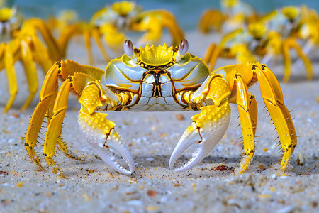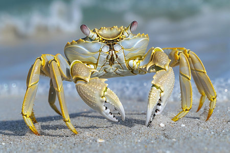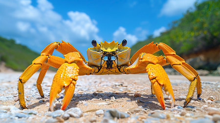 A vivid yellow crab with azure eyes and immense claws stands proudly on the sun-kissed beach. Its formidable pincers and intricate shell create a striking contrast against the golden sand and cerulean sea. A captivating glimpse into the vibrant life that thrives along the coastal shores.