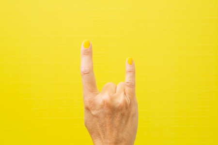 Horizontal photograph of a woman's hand making the typical heavy metal horns with her nails painted yellow.
