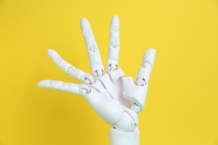 One white mannequin hand on yellow background