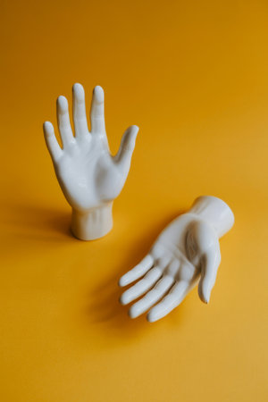 Two white ceramic hands are positioned on a vibrant yellow surface, showcasing their unique shapes and forms. This artistic arrangement highlights creativity and design.