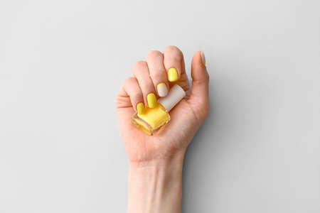 Female hand with beautiful manicure and nail polish on light background