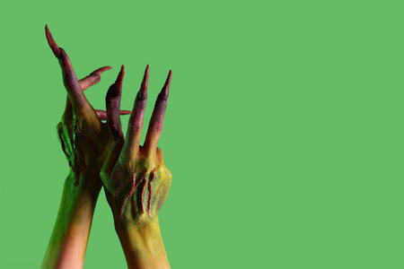 Hands of witch with claws on green background. Halloween celebration