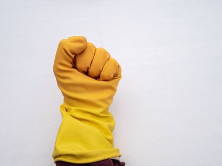 Close up on hand of unknown caucasian woman female girl putting on protective yellow rubber gloves to clean or disinfection against blue wall background in day