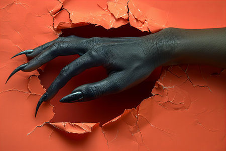 Hand with black nails breaking through a red wall, 3d illustration