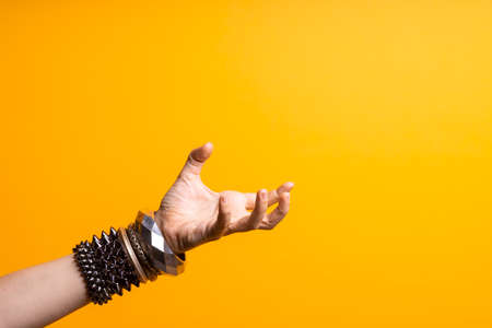 Hand gestures. To grab something. Womens hand with lots of bracelets, youth fun style.